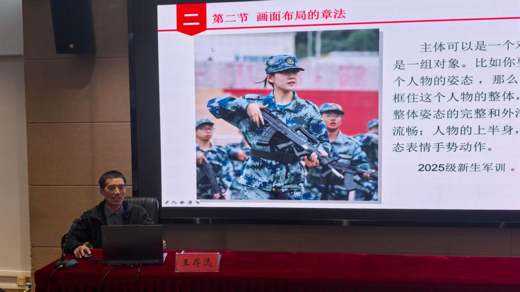 讲座中,王存选紧扣新闻摄影实战需求,从构图、光线、对焦、时机四个维度展开讲解。针对不同拍摄场景,王存选详细解析了大型活动的俯拍技巧与人像特写的自然神态捕捉,强调要合理运用栏杆、树叶等前景元素增强画面层次感。在讲解技术要点的同时,王老师还分享了光线把控与拍摄视角的选择技巧。结合多年工作经验,他建议同学们提前熟悉活动流程,预判关键节点,确保捕捉最具代表性的瞬间。讲座现场气氛活跃,同学们就活动拍摄中遇到的困惑积极提问,王老师均给予了耐心细致的解答。