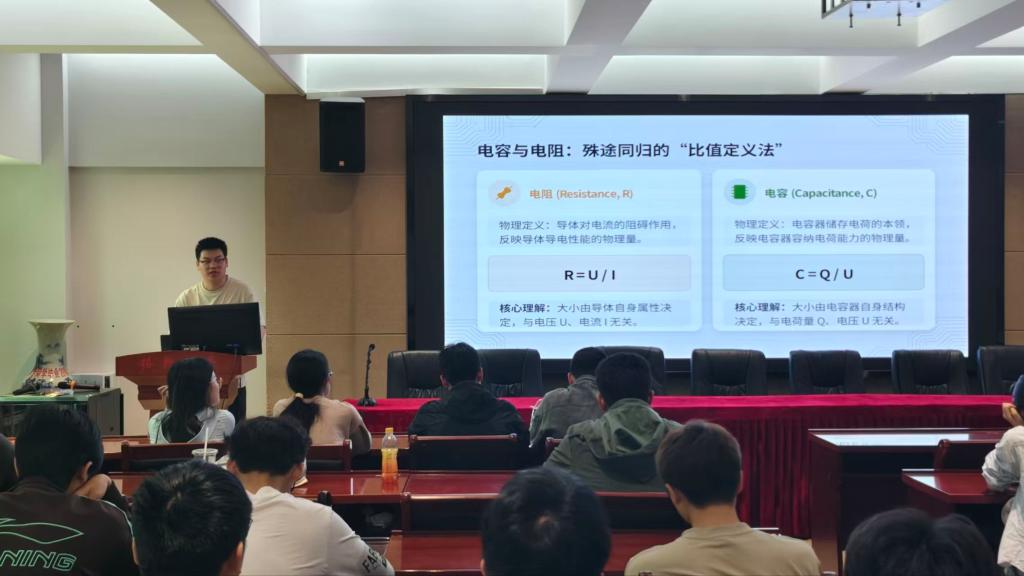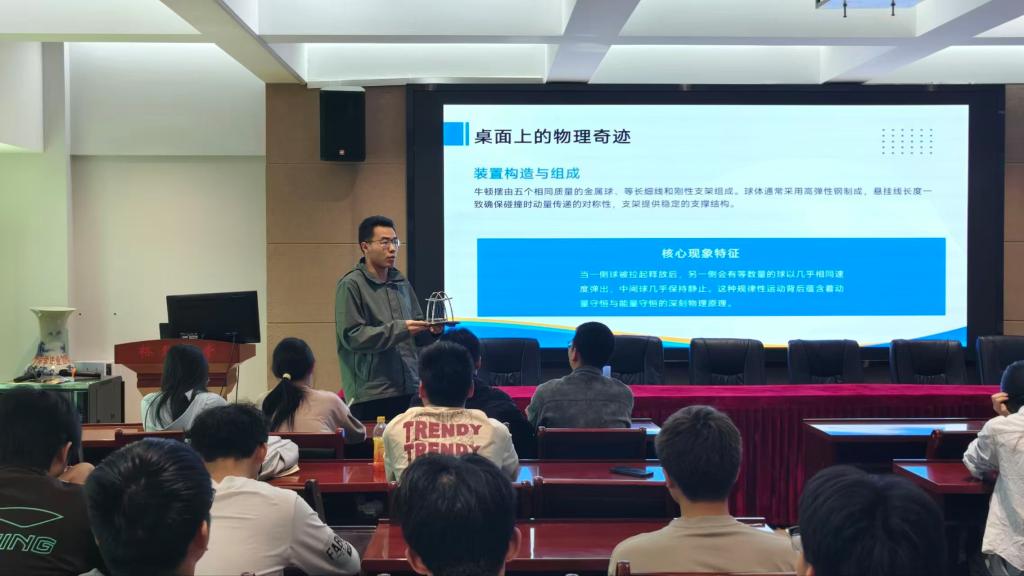 七位参赛选手依次登台,围绕光学、力学、电学、热学等多个物理知识点展开精彩讲解。梁怡婷细致解析光的折射现象,王琦轩深入阐释杠杆原理,熊涵聚焦磁汇聚展开分享,张志鹏巧妙运用类比法讲解电容器连接,袁浩铭以牛顿摆为切入点,解读碰撞过程中的守恒规律,陈淑媛系统介绍大气压强相关知识,刘翔则结合生活实例,综合讲解力学、电学、热学与光学四大领域。选手们讲解精炼、逻辑清晰,将抽象概念具象化,获得现场观众一致好评。